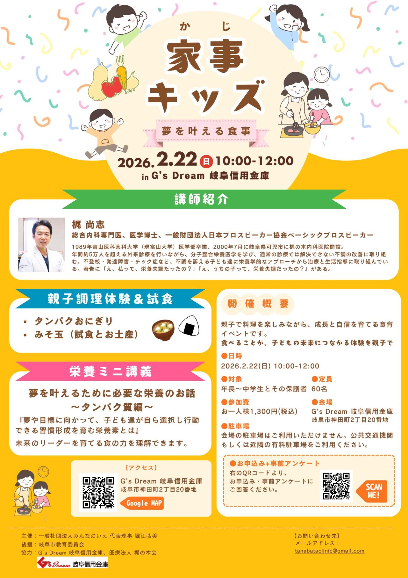 お知らせ news HOMEお知らせ2026.2.22(日)開催 親子で体験する食育イベントのお知らせ 2026.01.06 その他 2026.2.22(日)開催 親子で体験する食育イベントのお知らせ 親子で体験する食育イベント「家事キッズ ~夢を叶える食事~」 親子で料理を楽しみながら、成長と自信を育てる食育イベントです。食べることが、子どもの未来につながる体験を親子で 日時2026年2月22日(日)10:00-12:00 会場G’s Dream 岐阜信用金庫〒500-8833 岐阜市神田町2丁目20番地 対象年長〜中学生とその保護者(定員60名) 講師梶 尚志 先生(七夕医院名古屋院総院長) プログラム・親子調理体験&試食・栄養ミニ講義 お申し込み受付中!! イベントに申し込む 一覧に戻る 次へ